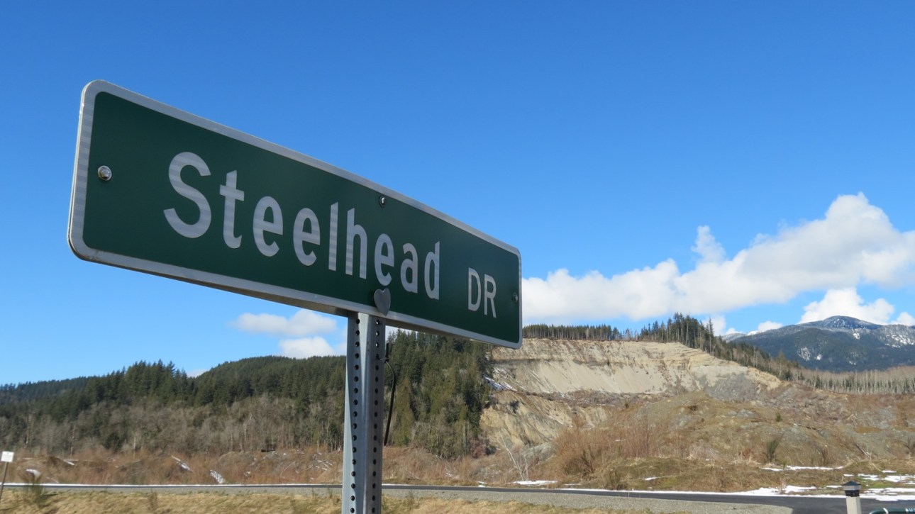 I took a photo of the Steelhead Dr. street sign that marks the road that once led into the Steelhead Haven neighborhood. I looked into the distance, in awe of nature’s power and the movement of earth. I made my way between the trees planted in memory of the lives lost. There are signs with names, homemade tributes. The sacred place awaits a fuller memorial.